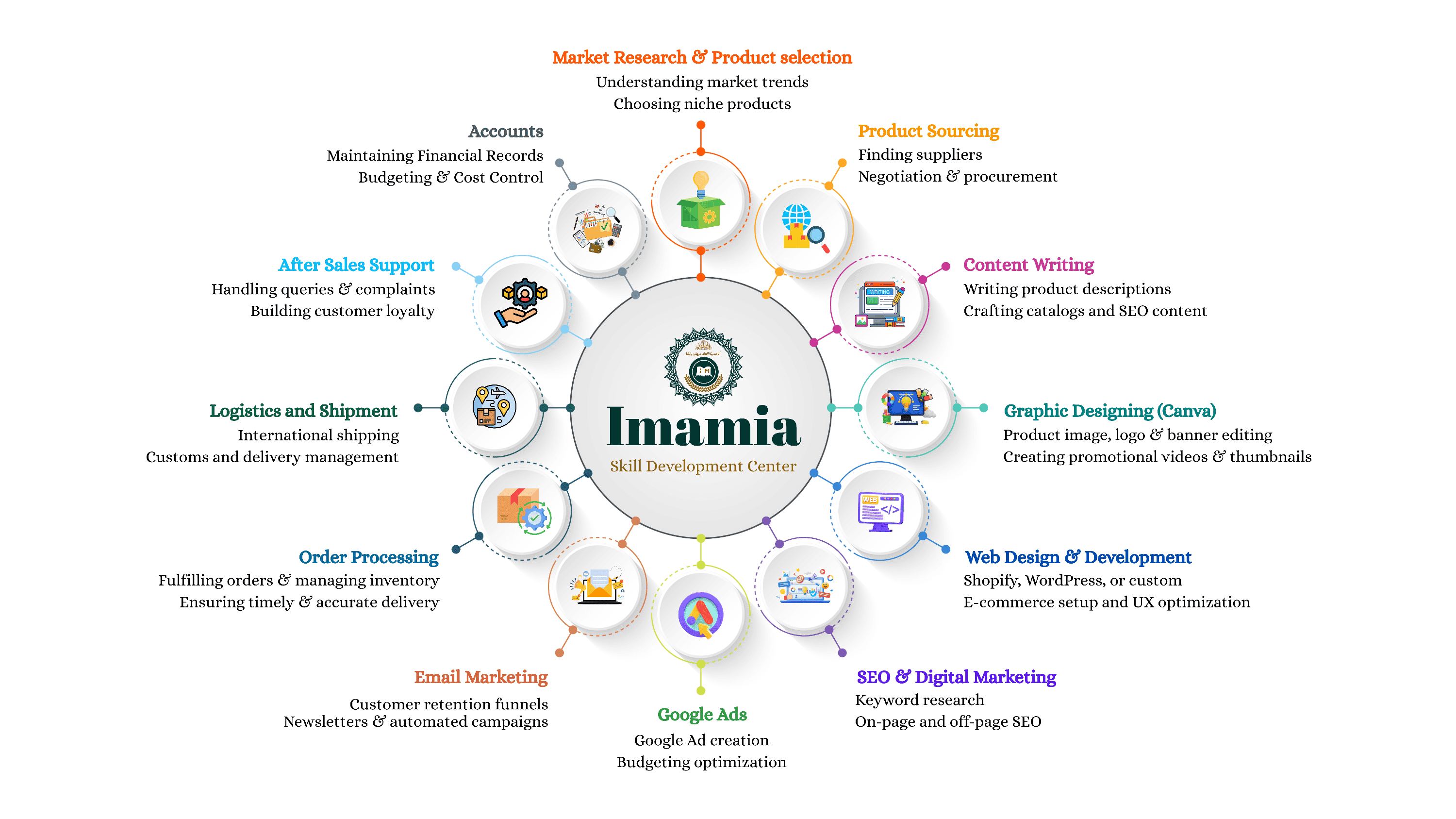 At Imamia Centre, we offer a complete, step-by-step training program that transforms beginners into confident entrepreneurs. From product research and branding to website creation and digital marketing, we cover every skill needed to start and run a successful online business. Our program blends technical training with real-world practice, ensuring you're ready to earn while you learn. Whether you're launching your first product or building a full brand, we’re with you at every stage.